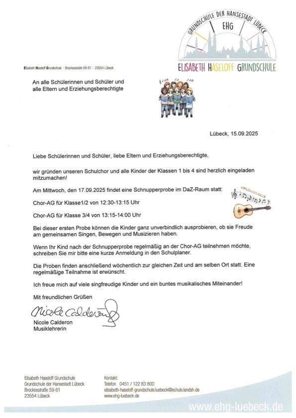 In diesem Schuljahr gibt es dank unserer neuen Kollegin Frau Calderon erstmalig eine Chor-AG für die Kinder an unserer Schule.